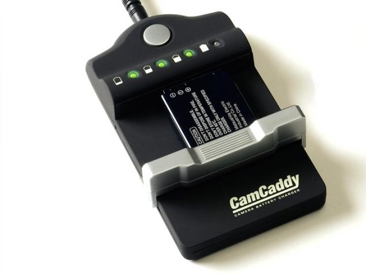 It comes with a unique power cradle called a Camcaddy which can charge any camera battery from compact digital cameras to professional single lens reflex camera (SLR) and even video camera batteries. See more information on the Camcaddy.