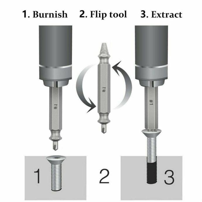 ENOSTAVEN ZA UPORABO – dovolj je, da izvrtate luknjo v zlomljen vijak in privijete ekstraktor, pa se vijak odvije sam. V pomoč vam bodo, ko navaden izvijač ali nastavek ne bo kos poškodovanemu vijaku.