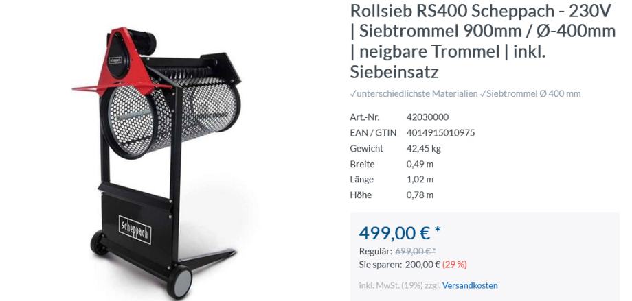 Vrtljivi stroj RS 400 je neprecenljiv pomočnik pri presajenju razsutih materialov. Tla, pesek, kompost in druge ohlapne snovi s kapaciteto do 3 m3 na uro. Premer luknje v 2 cm mreži lahko s standardnim vložkom zmanjšamo na 1 cm. Boben je nastavljiv in je opremljen s krtačo, ki neprekinjeno čisti luknje tudi pri delu z mokrim materialom, stroj je opremljen z dvema kolesoma za lažji transport.