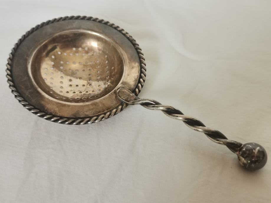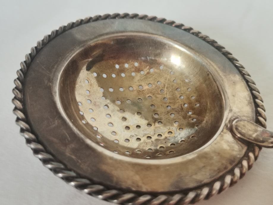 Srebrno cedilo za čaj, čas po 2. sv. vojni, srebro 800/1000, Anglija