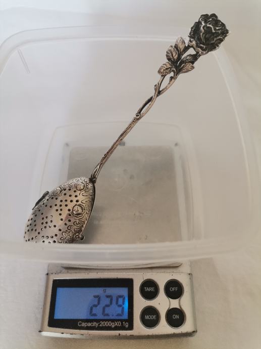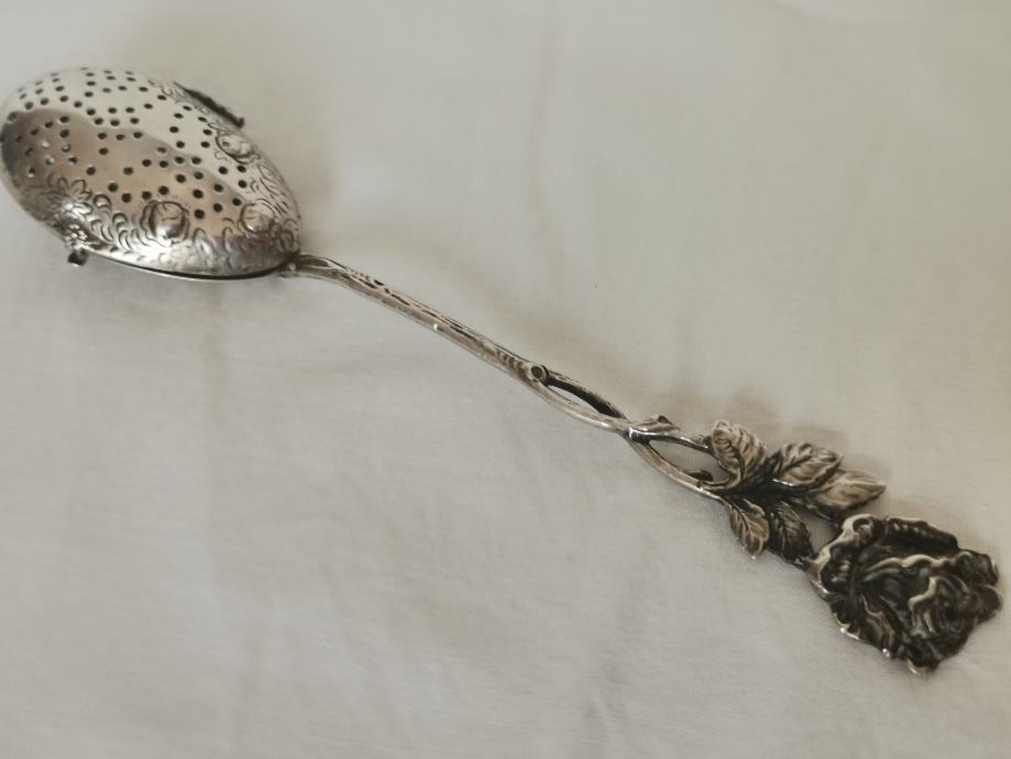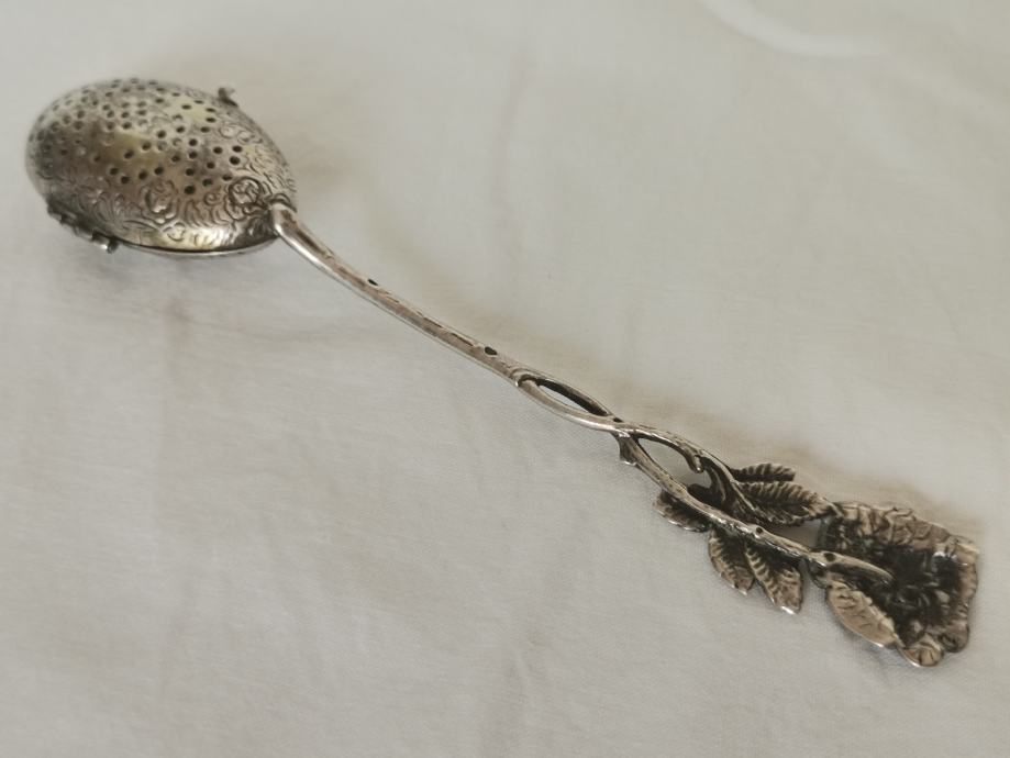 Srebrno cedilo za čaj v obliki žlice, izredno dovršen dekor, ročaj v obliki vrtnice, srebro čistine 835/1000.