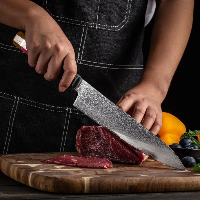 Prodam nov zapakiran komplet 11 japonskih nožev (lahko posamezno) za kuhinjo. Narejeni so iz Damaska, 67 plasti, trdo jedro je japonsko jeklo VG10 in kitajsko jeklo Cr15CoMoV. Ročaji so iz pisaniega stabiliziranega javorjevega lesa, z dobrim oprijemom.