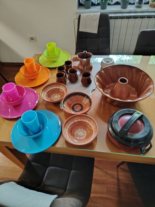 Lončeni pekač glineni za pecivo, termus termo posoda, lončeni vrč majolka s kupicami, lončeni sklede fi 18cm, pepelnik , vse nerabljeno,