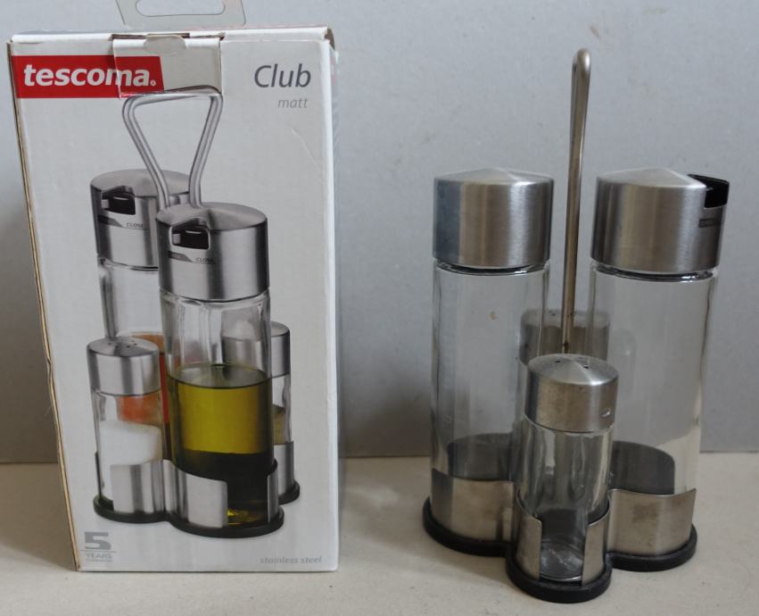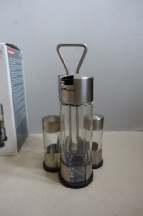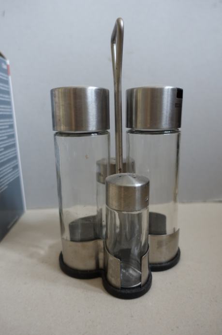Stojalo, posodice za olje, kis, poper in sol.