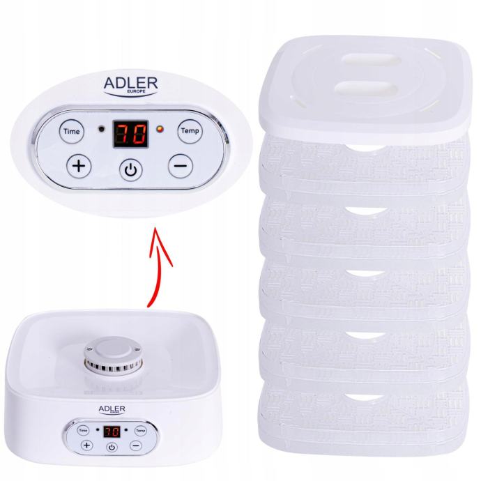 Dehidrator ima vgrajen časovnik. Nastavite lahko čas njegovega delovanja od 1 do 70 ur. Temperaturno območje je od 35 do 70°C, tako da lahko tukaj sušite poljubne izdelke. Gre za opremo, ki vam omogoča domačo proizvodnjo zdravega sadnega in zelenjavnega čipsa, lastne Vegete ali suhega mesa, rib ali celo testenin.