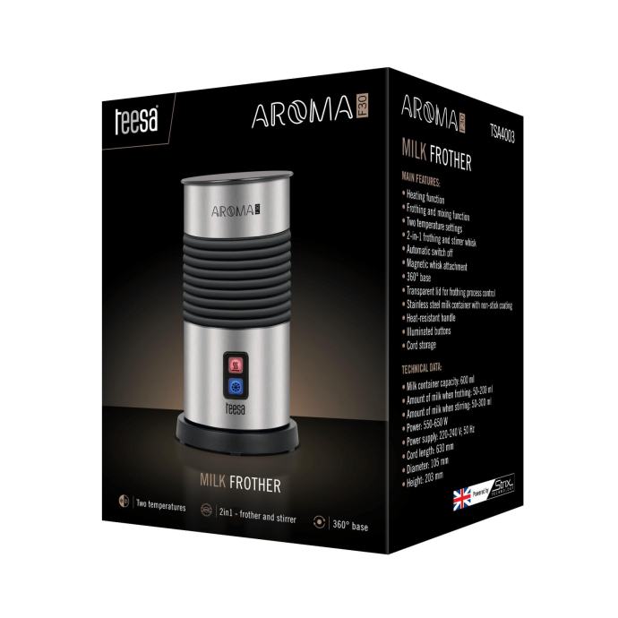 Z močnim 650W grelnikom AROMA F30 lahko hitro in enostavno pripravite toplo ali penasto mleko, ki je popoln dodatek vaši najljubši kavi ali drugim napitkom. S kapaciteto 600ml lahko pripravite dovolj mleka za več skodelic kave ali čaja, kar vam omogoča, da svoje goste razvajate s profesionalno pripravljeno peno mleka kar doma.
