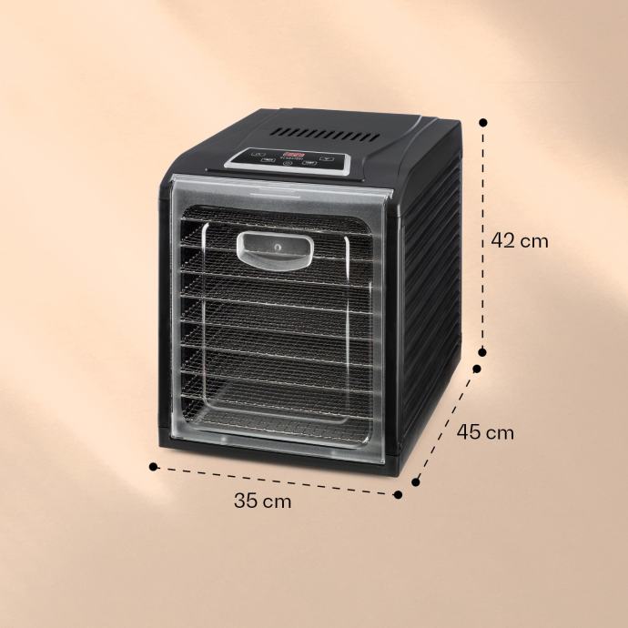 Na zaslonu lahko priročno nastavite temperaturo in čas sušenja. Preprosto razporedite želena živila na vsako raven, namestite pokrov in lahko začnete.