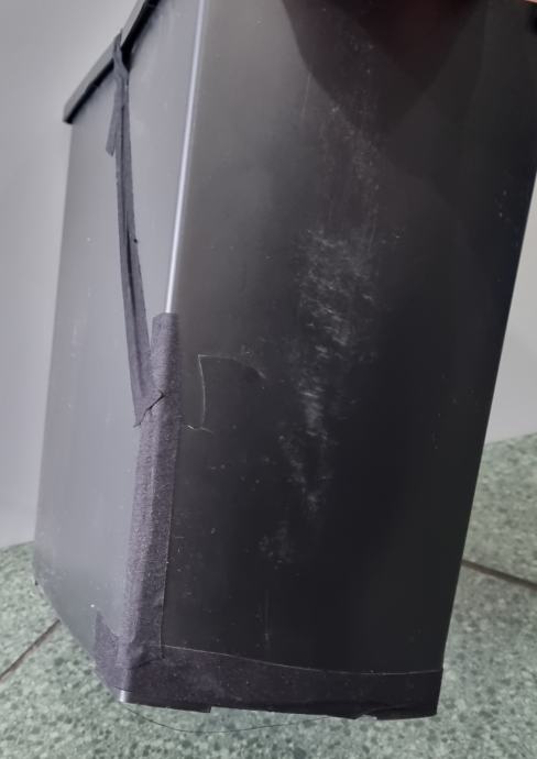 Ima počeno ( in zalepljeno s trakom ) posodo, plastika na levi strani motorja je malo počena. Ne vpliva na delovanje.