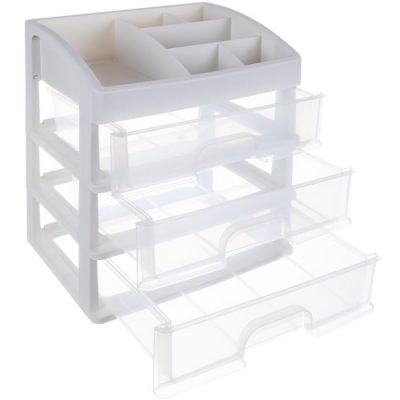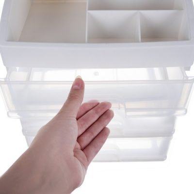 3 PROZORNI PREDALI – organizator je izdelan iz prozornega materiala, zahvaljujoč kateremu lahko jasno vidite, kaj je v notranjosti, tako da lahko hitro najdete predmet, da ga dosežete. Ima 3 prozorne predale enake velikosti .