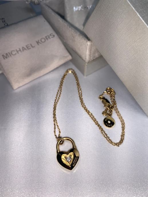 Prodajam zelo lepo ohranjeno verižico zlate barve z obeskom ključavnice v obliki srca,ki je iz pozlačenega nerjavečega jekla,na sredini pa ima tudi okrasni kristal.Na samem srčku je tudi vgraviran logotip Michael Kors.