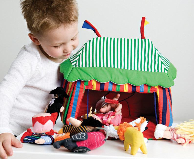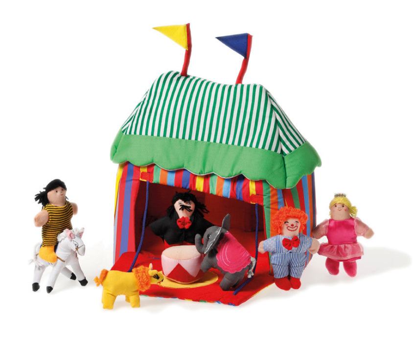 Barvit cirkuški šotor poln zabave vključuje živali in zabavljače. Sprednja stena in streha šotora se odpreta in spremenita v razburljivo areno. Cirkuški komplet vsebuje: slona, belega konja, leva, čarovnika, klovna, akrobata, cirkuško princeso in gimnasičarja. Prednost igralne torbe je še odprtina na zadnji strani, ki igro spremeni v lutkovno predstavo. Skupaj 9 kosov.