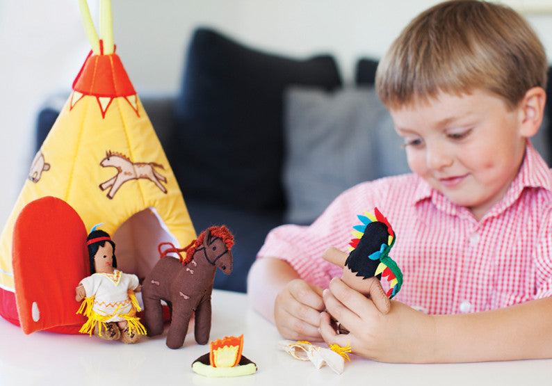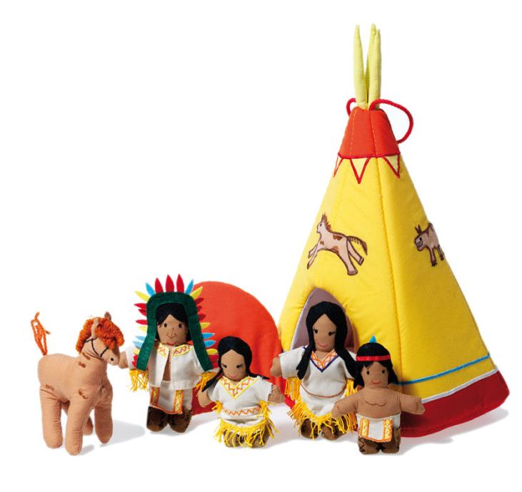 Prostoren indijanski šotor, približno 35 cm višine, z izvezenimi stenskimi poslikavami konja, medveda in volka. Stenski motivi prikazujejo česa se je družina bala (medveda, volka) in za kaj je bila hvaležna (konja). Štiričlanska družina indijanskega plemena so pripravljeni na dogodivščino z konjem in tabornim ognjem. Ljubki mokasini na njihovih nogah so snemljivi, kot tudi nekaj oblek. Skupaj 18 kosov.