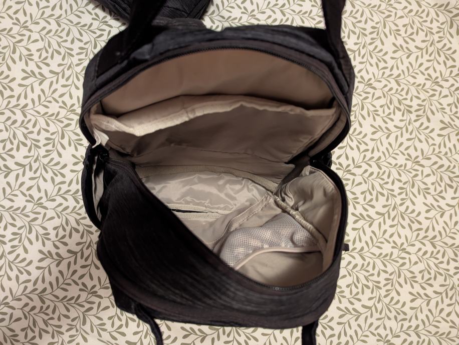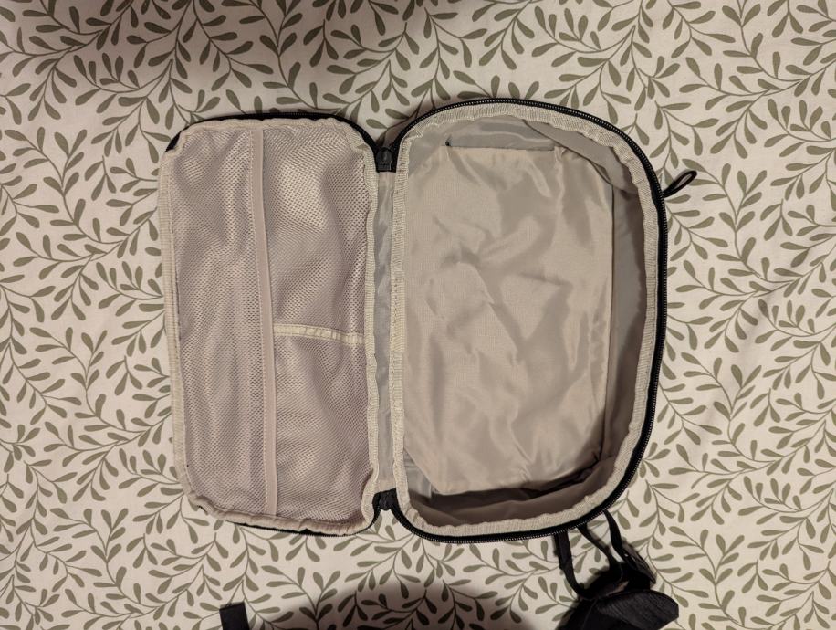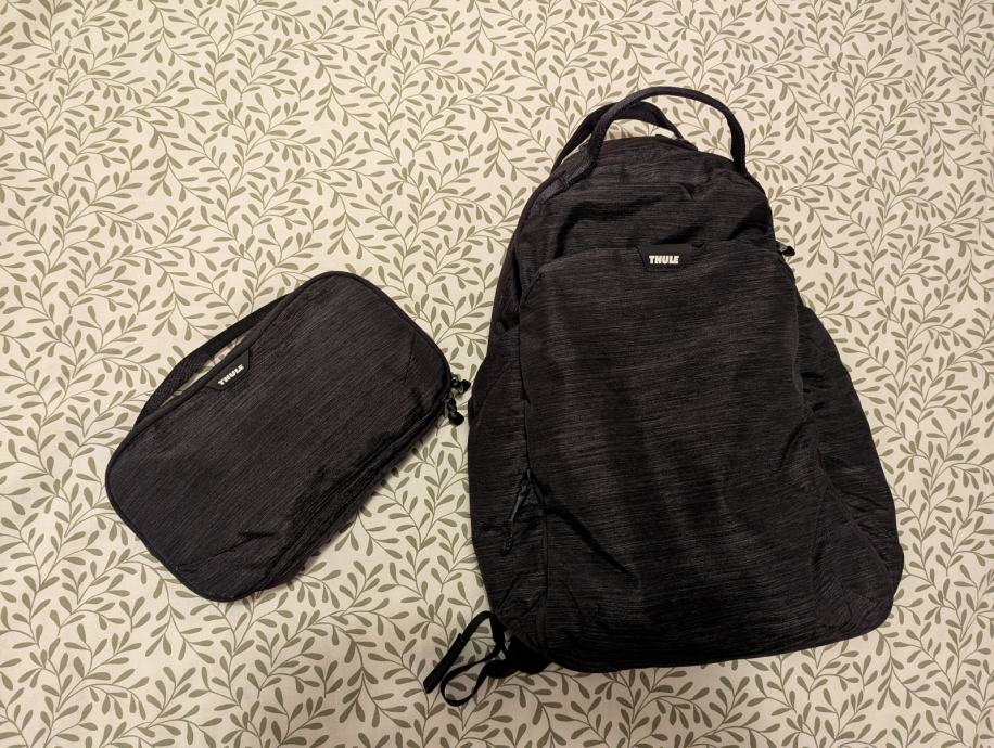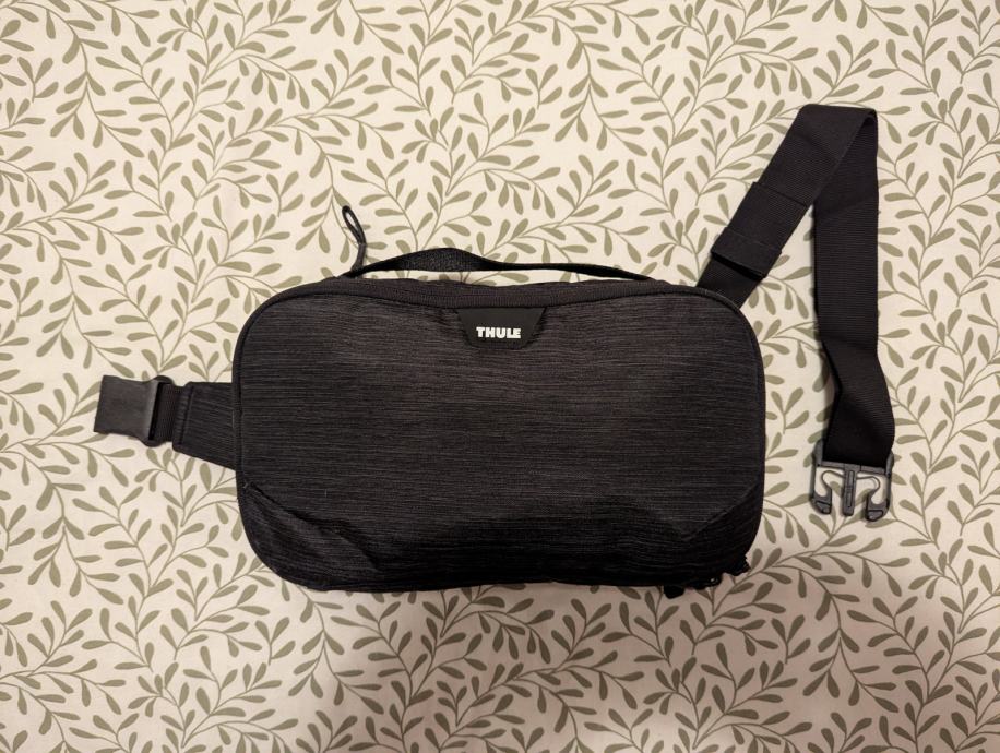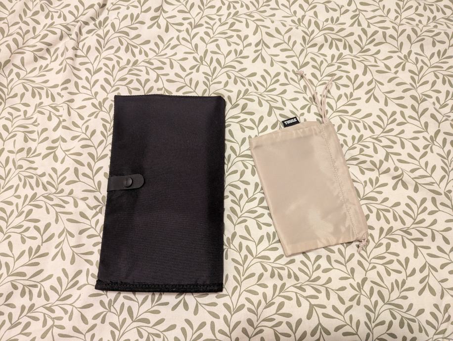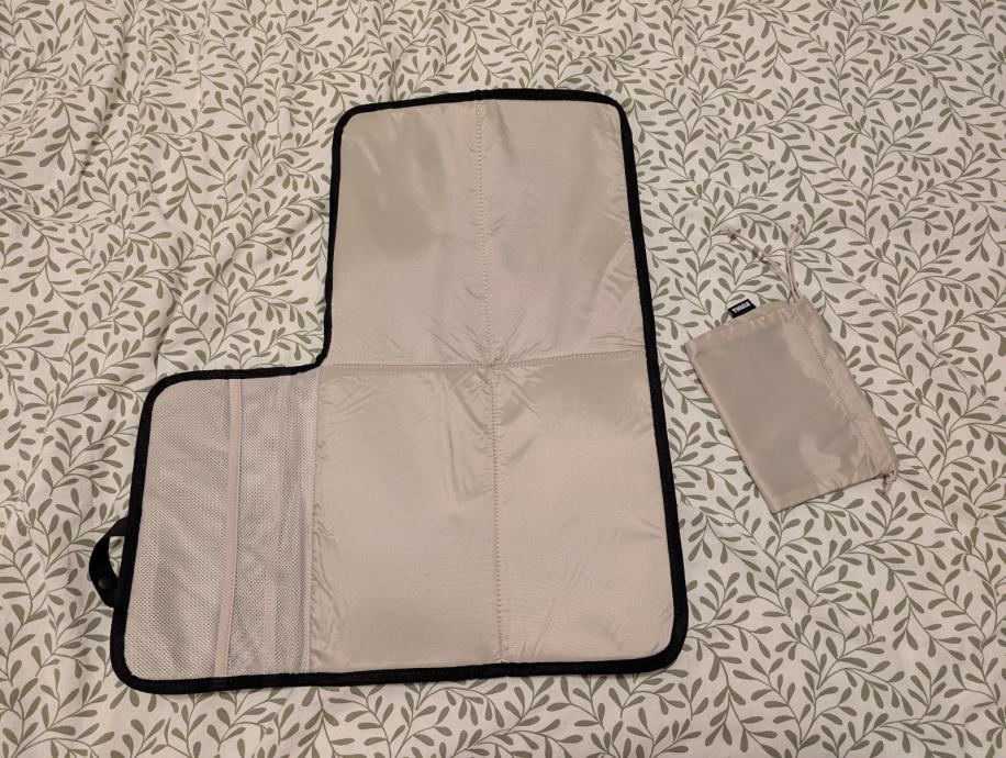 Thule previjalni nahrbtnik, ki vključuje previjalno podlogo z manjšo vrečko za umazana oblačila ter odstranljivo eno naramno torbico.