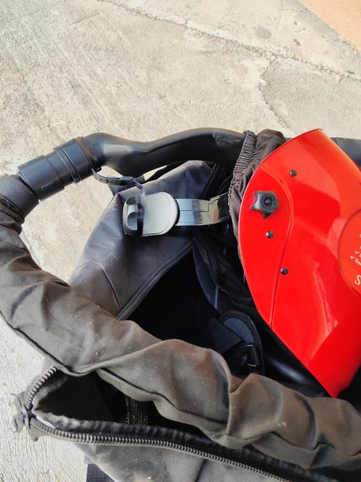 Varilna maska s filtrom in filter čez rami in pas. Filter se polni.
