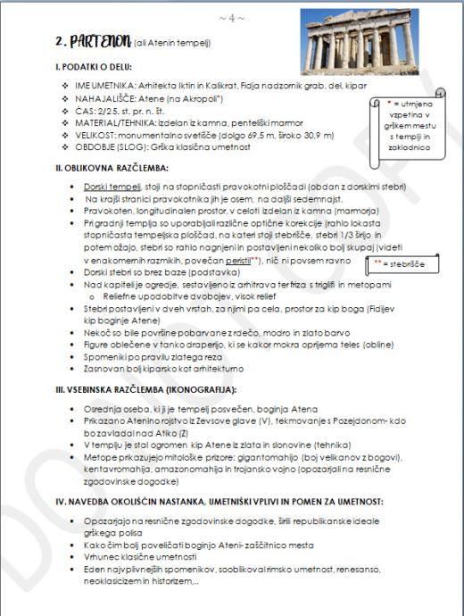 Prodajam natipkane povzetke s slikovnim gradivom izpiskov za umetnostno zgodovino na maturi. Poleg povzetkov so razloženi tudi pojmi, ki jih je za maturo treba poznati. Vključenih je vseh 48 spomenikov. Izpiski so narejeni s pomočjo učbenika Umetnostna zgodovina- Izbrani temeljni spomeniki za splošno maturo, ter s pomočjo rešitev maturitetnih nalog (do leta 2019). Zraven povzetkov esejev imam tudi splošna navodila za ocenjevanje in obdobja, na katera se umetnostna zgodovina deli (za lažje razumevanje). S temi zapiski, vam zagotovljeno prihranim veliko dela in časa, zavzemajo vse, kar je treba znati za maturo.