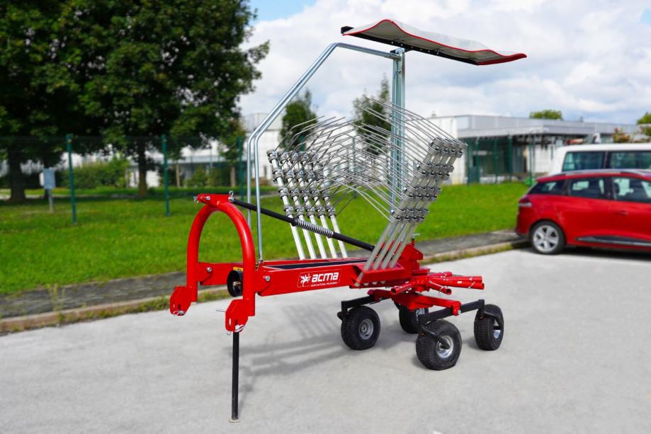 Acma G340 je lahek, a izredno robusten rotorski zgrabljalnik, zasnovan za hitro in natančno oblikovanje čistih, enakomernih in dobro zračnih zgrabkov. Z delovno širino 340–390 cm pokriva velike površine v kratkem času, plavajoče 3-točkovno vpetje in tandemsko podvozje pa zagotavljata vrhunsko kopiranje terena brez poškodovanja ruše. Amortizer učinkovito duši tresljaje na neravnem terenu, kar poskrbi za mirnejši tek stroja in manjšo obrabo ključnih komponent.