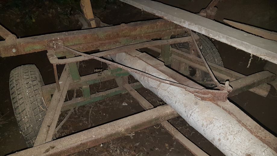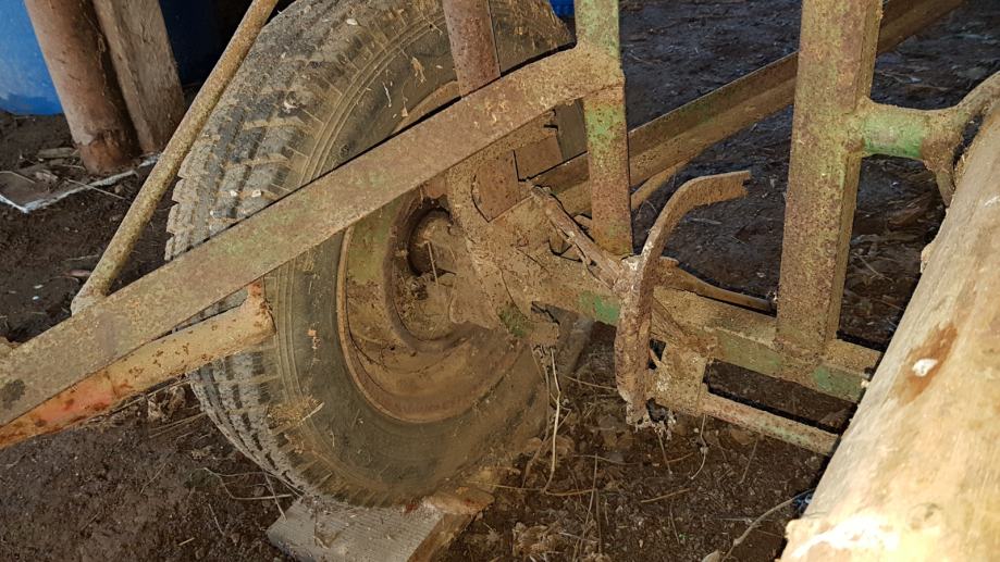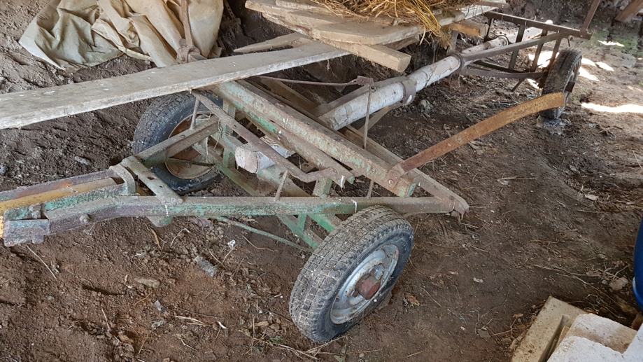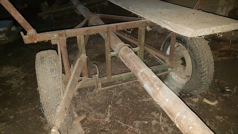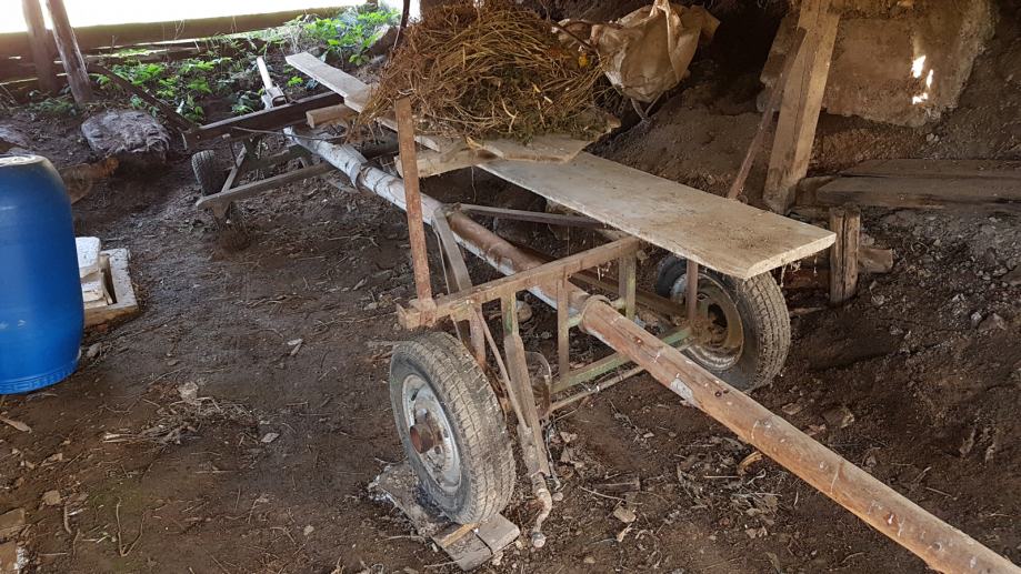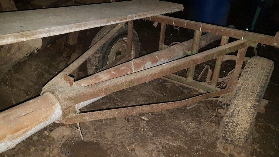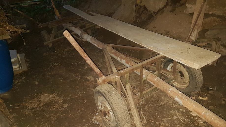 Voz je širine cca 125 cm, dolzina sure cca 5m, kovinska štanga za priklop 1,5m, osnovna dimenzija trikotnikov spredaj in zadaj je cca 125x150cm. dolzina zadnjega dela skupaj za kolesi in drogom za zavoro 160cm, dolzina sprednjega dela od noislaca za suro do zacetke stange za priklop 200cm. Lokacija občina Velike Lašče.