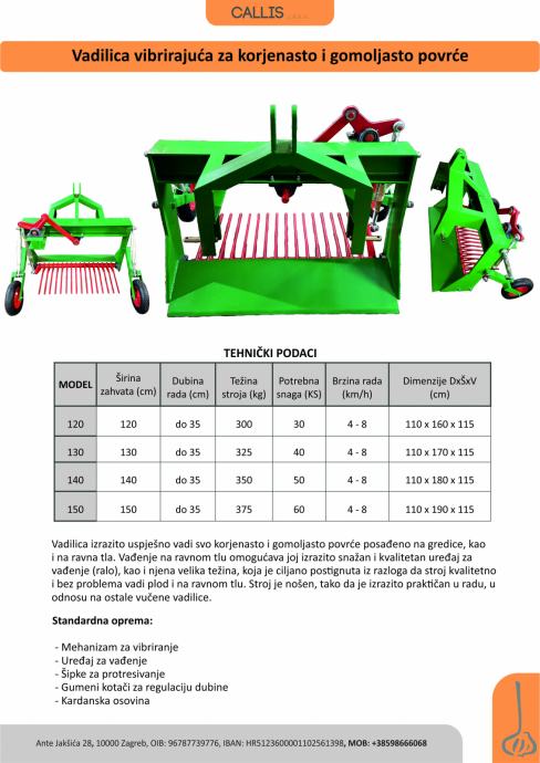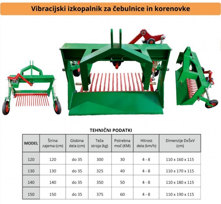 Izkopalnik je izjemno uspešen pri izkopavanju vseh čebulnic in korenovki, zasajene tako na brazde kot tudi na ravno zemljo. Uspešno izkopavanje omogoča močan in visokokakovosten lemež izdelan iz kakovostnega HARDOX jekla, kot tudi njegova teža (300-350kg), ki je dosežena nad lemežom za lažji vstop tudi v najtežjo zemljo. Priključen je nošen, zato je še posebej praktičen za uporabo.