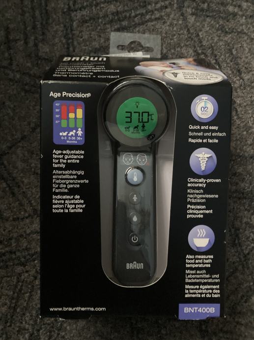 Prodam braun čelni termometer BNT400B čne barve,aparat je nov,še neuporabljen original zaprt,ker smo ga dobili za darilo in ga ne uporabljamo ga prodamo.