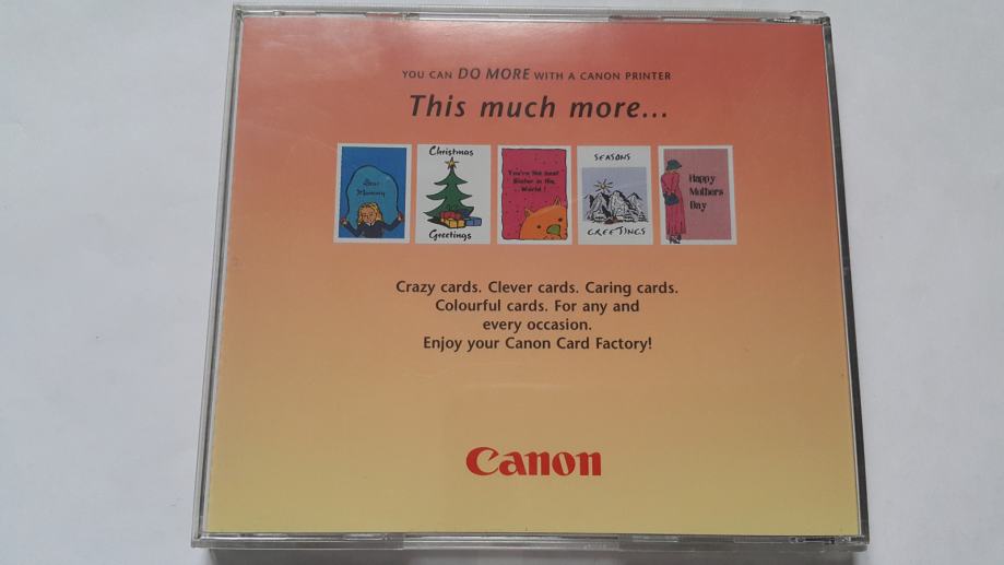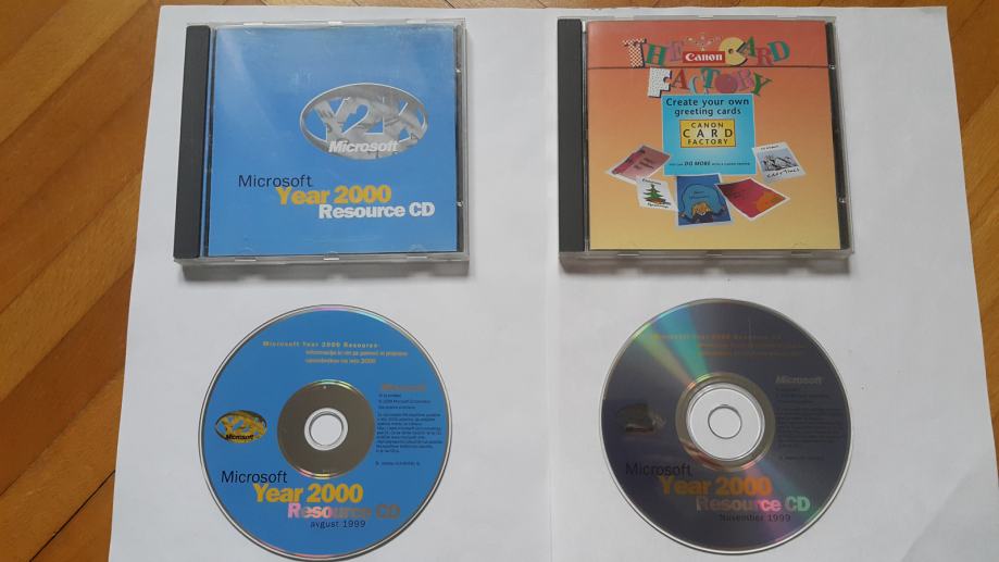 Prodam 4 raznorazne računalniške (še berljive) zgoščenke. Prva je Microsoft Year 2000 Resource CD November 1999, druga od Canon Card Factory (programje za izdelavo voščilnic), tretja Microsoft Year 2000 Resource CD Avgust 1999 in zadnja spet očitno ista kot prva zgoščenka. Najraje bi vse v kompletu prodal (da se naenkrat vsega znebim - cena v oglasu je za to), lahko pa tudi posamično zgoščenko vzamete. V enem ali drugem primeru mi sporočite ponudbo preko Bolhe/SMS/klica koliko bi dali za kaj.