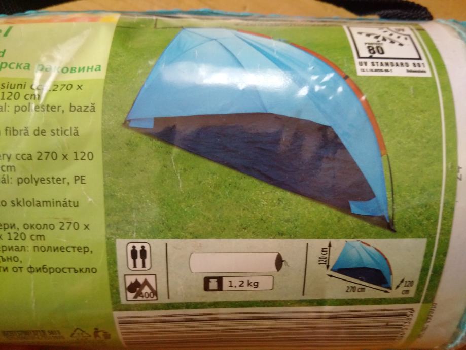 Prodam malo rabljen šotor za na plažo, velikosti 270(d) x 120(g) x 120(v), UV zaščita 80, v vreči, težak 1,2 kg, pritrdi s klini, da ga veter ne odpihne (ni pop up). Za prevzem kličite 031 602 781 ali pišite martina.gubensek@gmail.com.