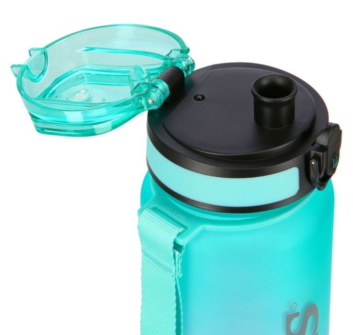 Bidon steklnica za vodo iz tritana se odlikuje po nenavadni kombinaciji vzdržljivosti, ergonomske oblike in funkcionalnosti. Zahvaljujoč lestvici na strani steklenice lahko spremljamo koliko vode smo spili. Nedvomna prednost je notranji vložek za sadje v obliki košare. Ima tudi tesen in udoben ustnik ter inovativen sistem odpiranja. Za pitje premaknite zatič navzdol in pritisnite gumb – nato se zapora luknje sprosti. Poleg tega ima steklenica plastični ročaj in zapestni trak za lažje nošenje.