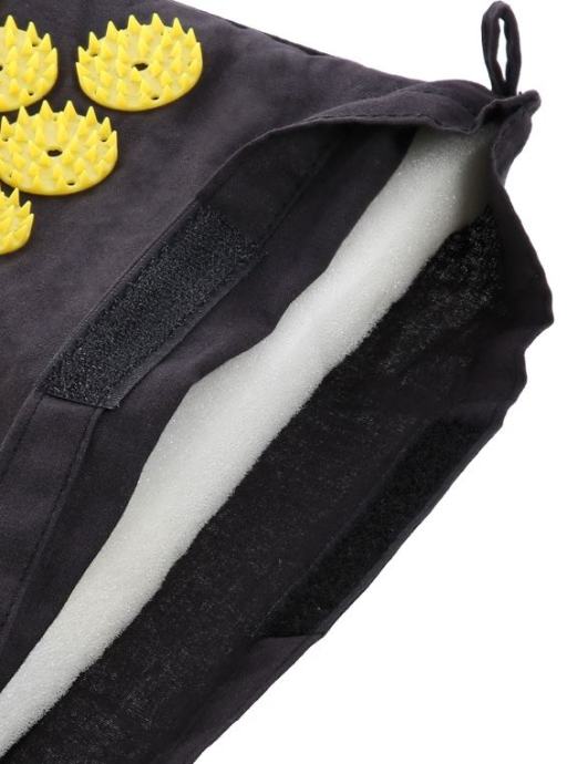 Daljša akupresurna blazina z vglavnikom ima masažne izbokline – akupresurne točke. Za akupresuro hrbta, trebuha, vratu, glave, stopal. Obesimo jo lahko na všiti zanki. Možna uporaba tudi na stolu. Odlična za sproščanje mišične napetosti, izboljšanje krvnega obtoka, pomiritev.