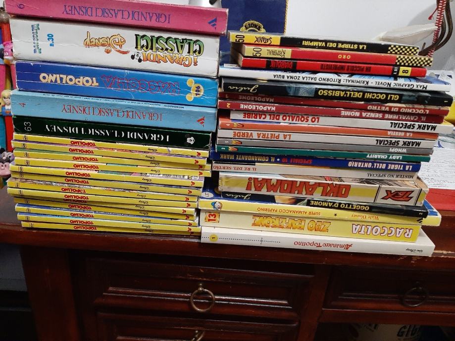 Nekaj manj kot 40 stripov v italijanscini tex,satanik,diabolik,kriminal,comandante mark,mister no,topolino in mnogo drugi prodam v kompletu mozna tudi menjava za znacke ali kako drugo zanimivo zbirko