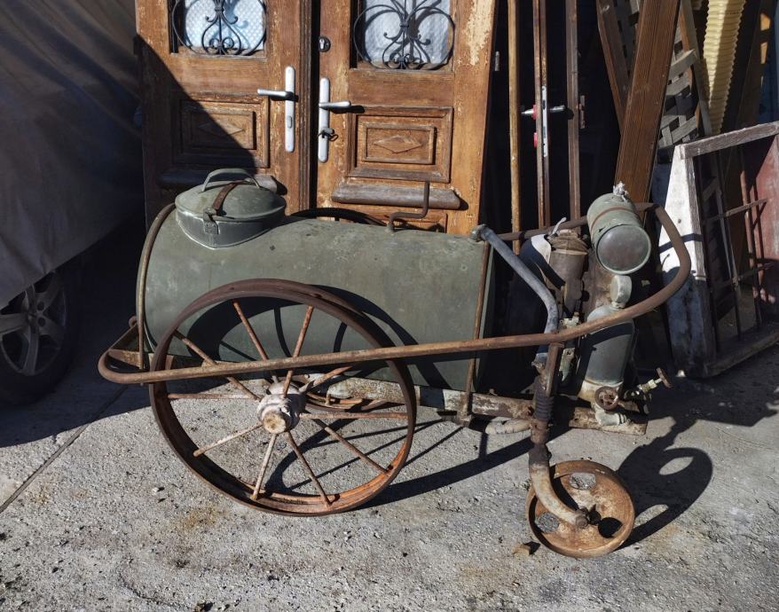 Dobro ohranjena škropilnica za hmelj volumna cca 150-200l z motorjem (nedelujoč) na kolesih.