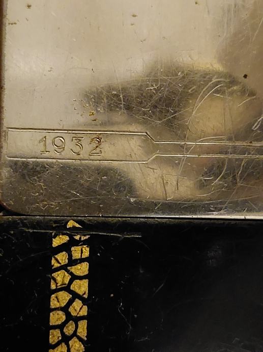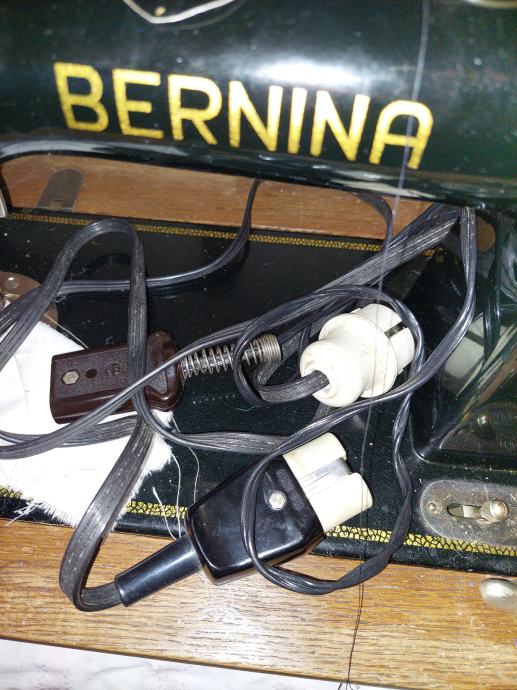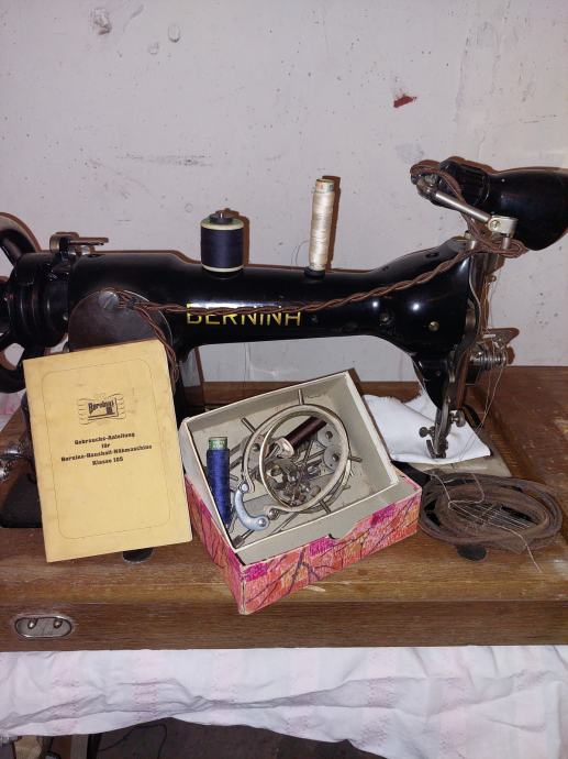 Ohranjen star šivalni stroj letnik 1932. BERNINA KL 105. Okraski v zlati barvi na stroju so lepo ohranjeni.
