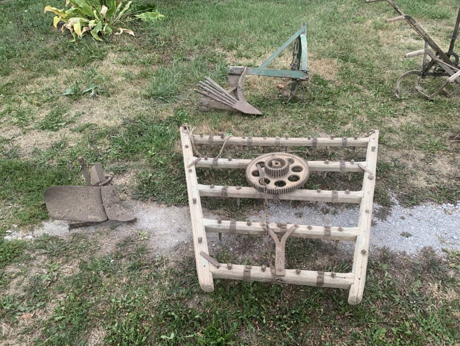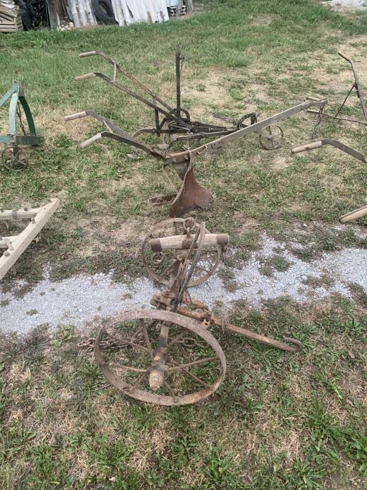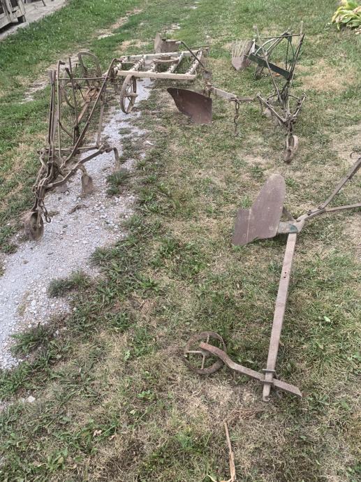 Na izbiro stara dobro ohranjena oprema za vprego ali traktor - plugi, brane, kultivatorji, razrahljači, obsipovalnik.