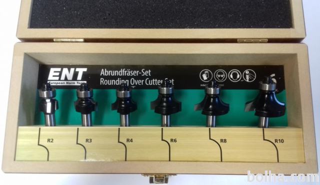 6 delni set nadrezkarjev z ležajom, za zaokroževanje robov. Vsebuje slednje rezkarje: R2, R3, R4, R6, R8, R10. Vpetje: 8 mm. Premer ležaja: 12,7 mm. Proizvajalec: ENT, Made in Germany. Kvaliteta: HW. Teža: 0,85 kg / set. Cena: 107,65 € z DDV. Zaloga: na zalogi (del redne zaloge).