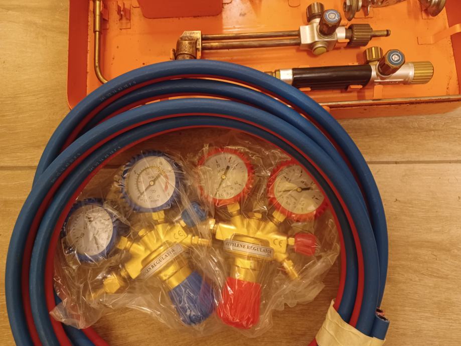oba NOVA manometra acetilen in kisik, obe NOVE nepovratne varovalke, rezalna pištola,plamenice, varilna pistola ,NOVE dvojne cevi,. skratka vse kar vidite na slikah, garnitura je v izpravnem delovnem stanju, zraven dobite tudi obe A-testirani slovenski jeklenki acetilen in kisik ki sta lahko ( 10l - 1m visoki,15cm debeli) zelo primerni za terensko delo, lahko so srednji 20l (1m visoka,,20cm debela), lahko pa so tudi velike jeklenke. Jeklenke so lahko polne. Garnituro je mozno tudi dostaviti in preizkusiti in dati navodila za varno delo. MESSER varilni kompeti so znani po neuničljivosti, natančnosti....Ugodno ! Ljubljana in okolica.