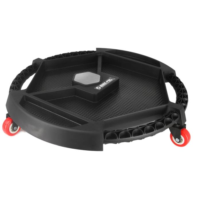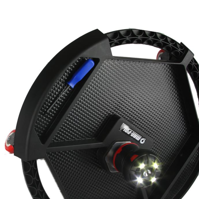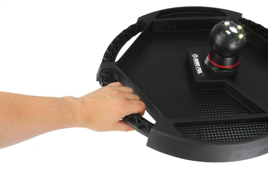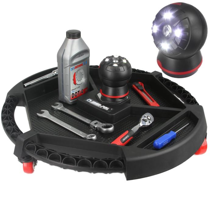 Izredno uporabna in uporabna v delavniškem pladnju, ki ga lahko zapeljemo pod avto in s seboj vzamemo potrebno opremo in pripomočke, v primeru težko dostopnih in temnih mest pa jih lahko osvetlimo s 360-stopinjsko LED diodo. svetilka , nameščena na magnet.