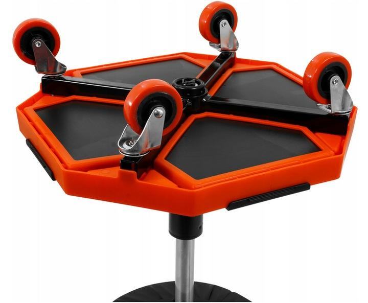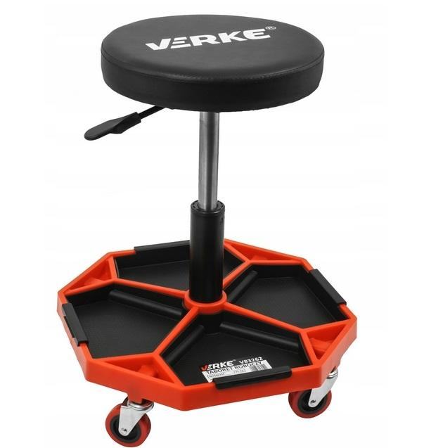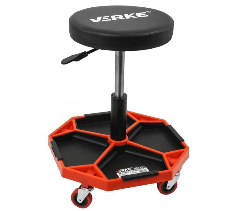 Delavniški stolček Verke je zasnovan za uporabo v profesionalnih delavnicah, avto servisih, servisih, odličen pa bo tudi za domačo garažo. Ima vrtljiv sedež in 4 vrtljiva kolesa, ki povečajo njegovo mobilnost. Praktična rešitev je, da ga opremimo z veliko polico, kamor lahko mehanik odloži orodje, ki ga uporablja med delom. Prevleka udobnega sedeža je izdelana iz PVC-ja. Zahvaljujoč pnevmatski nastavitvi višine se enostavno prilagodi višini osebe.