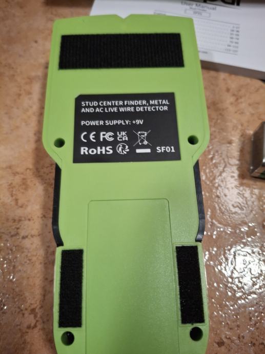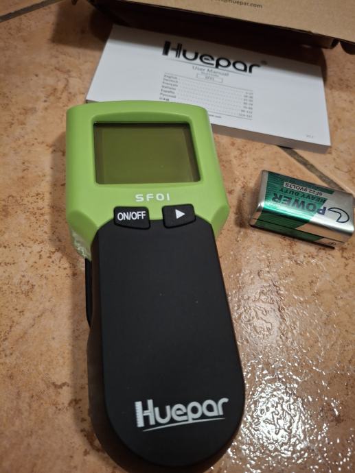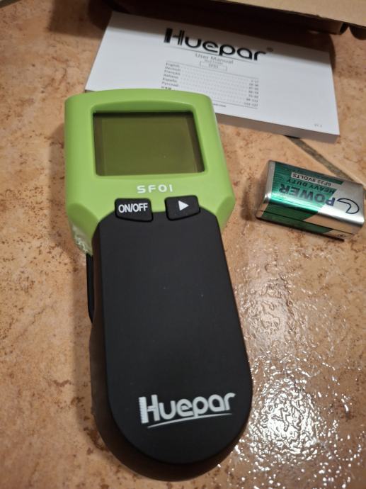 Detektor kovin in električnih kablov v stenah znamke Huepar SF01. Nov, nerabljen, prilozena baterija in navodila za uporabo.