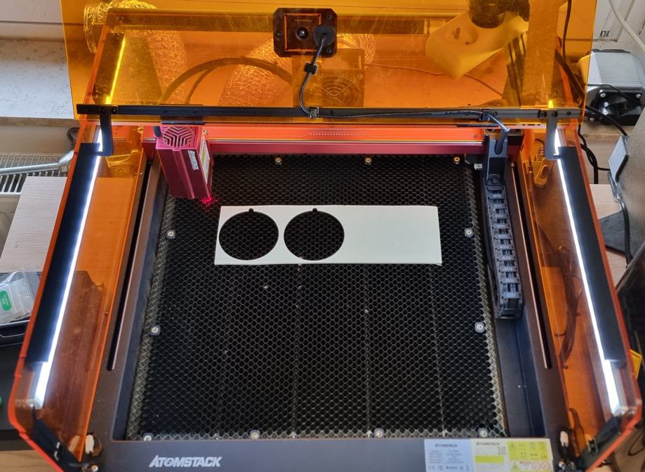 Vse skupaj je zmontirano na MDF ploščo, kot vidno na slikah. Honeycomb podlaga je montirana fiksno na MDF in je odmaknjena od plošče. Pod njo je kovinska plošča za zaščito MDF.