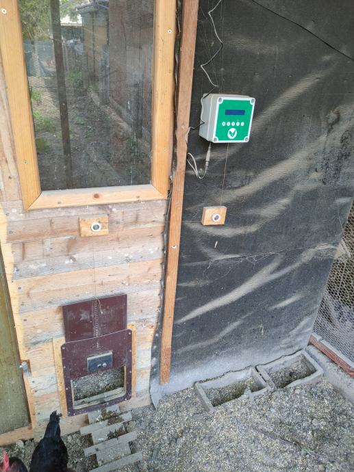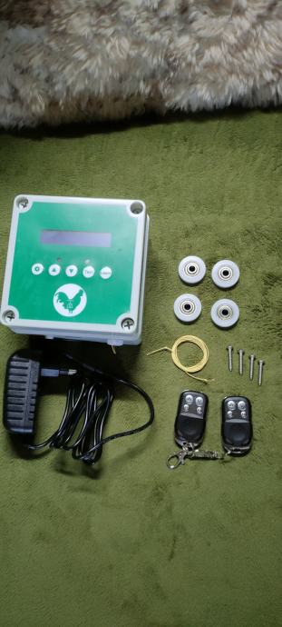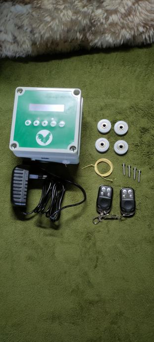 Neuporabljeno Lahko npr. za kokošnjak. deluje lahko na timer ali na svetlobo. Priložen el. adapter, lahko tudi na baterije ali sončne celice. brez vrat. ima tudi daljinska upravljalnika