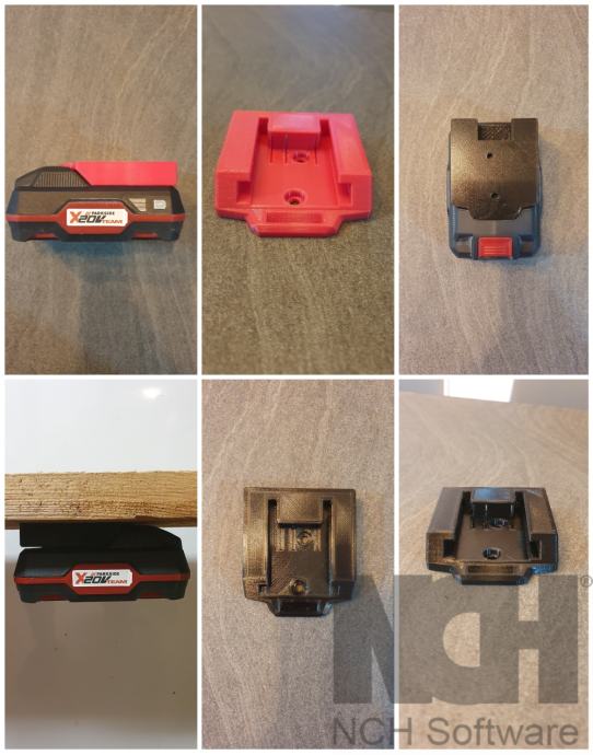 Nosilec za baterijo, z luknjami za vijake in režami za kontakte. BREZ KONTAKTOV. Namenjeno je predvsem za uporabo baterije na drugih baterijskih orodjih. Možna pritrditev na steno, pod mizo, v kombi... Baterija se zaskoči tako, da ni nevarnosti, da bi padla iz nosilca. Sprosti se s pritiskom na gumb, enako kot na baterijskem orodju. Iz PETG plastike v črni ali svetlo rdeči barvi, ali ASA v črni barvi. Lahko pošljem po pošti.