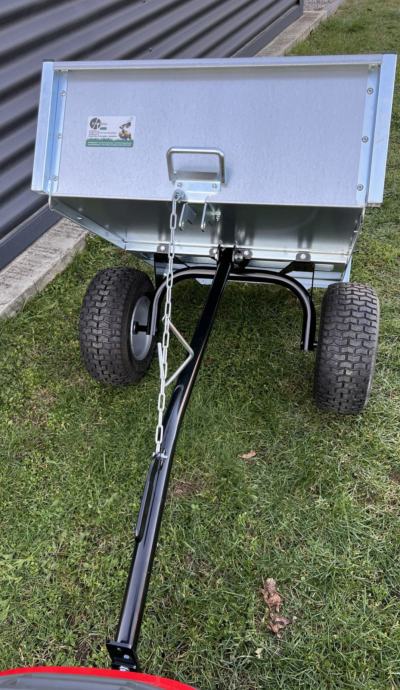 Edinstvena, robustna prikolica za vrtni traktor ali drugi stroj. Pocinkana, kiper in kar 300 kg nosilnosti, izpolni vsa pričakovanja.