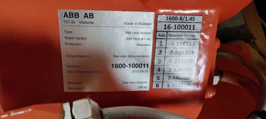 Robot IRB 1600 8/1.45, krmilnik IRC5. Doseg 1,45m, nosilnost 8kg.
