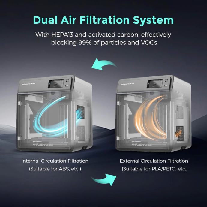 Flashforge Adventurer 5M Pro je zaprt 3D tiskalnik, opremljen z dvojnim filtrirnim sistemom, primeren za uporabo v zaprtih okoljih. Odlikuje ga 220 x 220 x 220 mm velik obseg tiskanja, kar vam omogoča izdelavo bolj izvrstnih modelov z velikimi velikostmi.