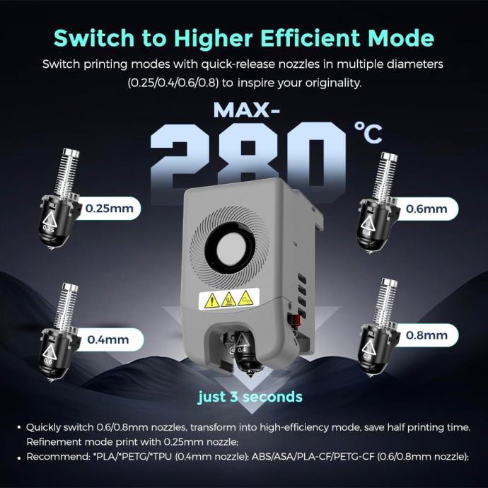 Konfigurira standardno hitrost tiskanja 300 mm/s in največjo hitrost ekstruderja 600 mm/s. Šoba s pretokom 32mm3/s, grelno močjo 50w in segrevanjem 200C v 35 sekundah močno skrajša čakalno dobo.