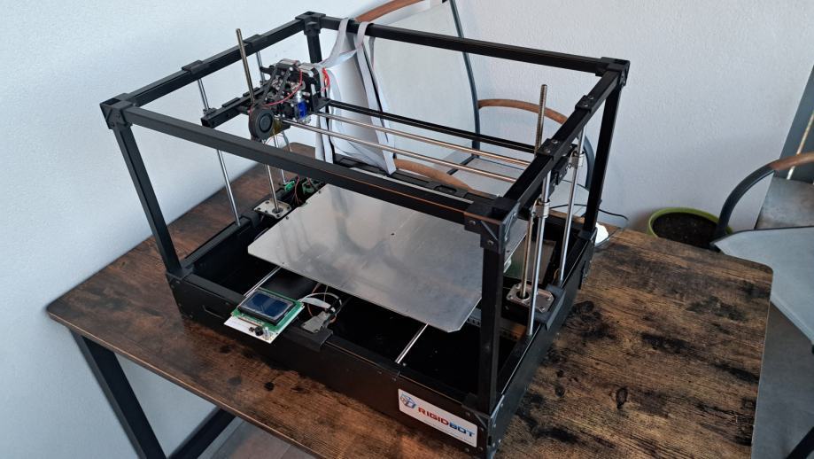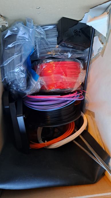 Priloženo: nekaj kg PLA materiala za tiskanje, dodatna steklena tiskalna površina, oba originalna Z motorja (eden je nedelujoč), raspberry pi za nadzor tiskanja preko mreže, zaščitna prevleka za tiskalnik