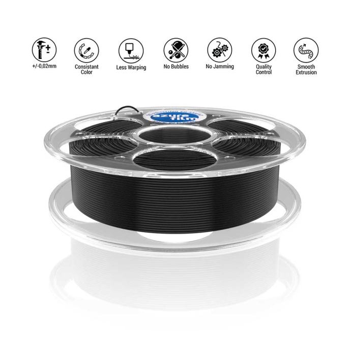 ABS Plus filament Črna, neto teže 1 kg (2,2 lbs), v legah navit na kolutu zunanjega premera 210 mm, z notranjo odprtino premera 60 mm in širino koluta 62 mm. Filament je vakumsko zaprt in vsebuje vrečko, ki vpija vlago in omogoča, da je filament vedno svež. Debelina ABS filamenta je 1,75 mm ali 2,85 mm.