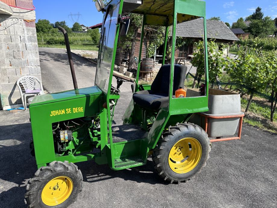 Ima motor od fičo. Menjalnik inverter, servo volan, hidraulikA,krdan, disk zavore.....v racun vzamem skuter moped kosilnico traktor ma koncno hitrost okoli 50 je zelo mocen in okreten