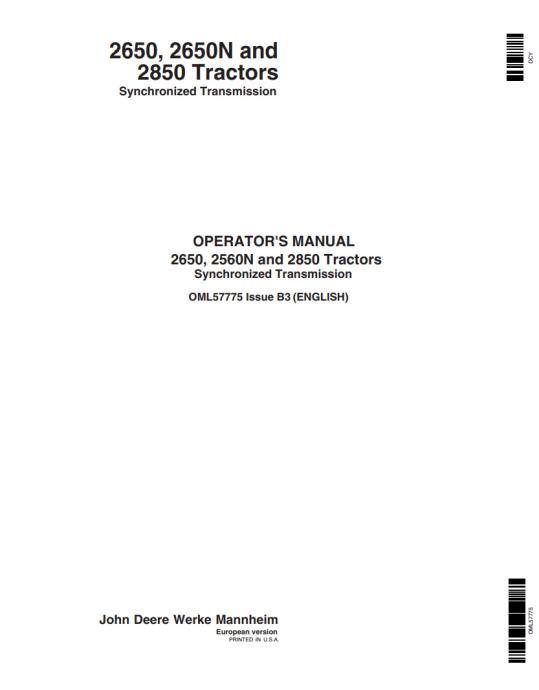Pdf dokument navodil za uporabe za traktorje John Deere 2650, 2650n, 2850. Angleški jezik.