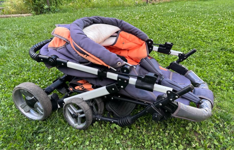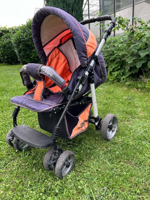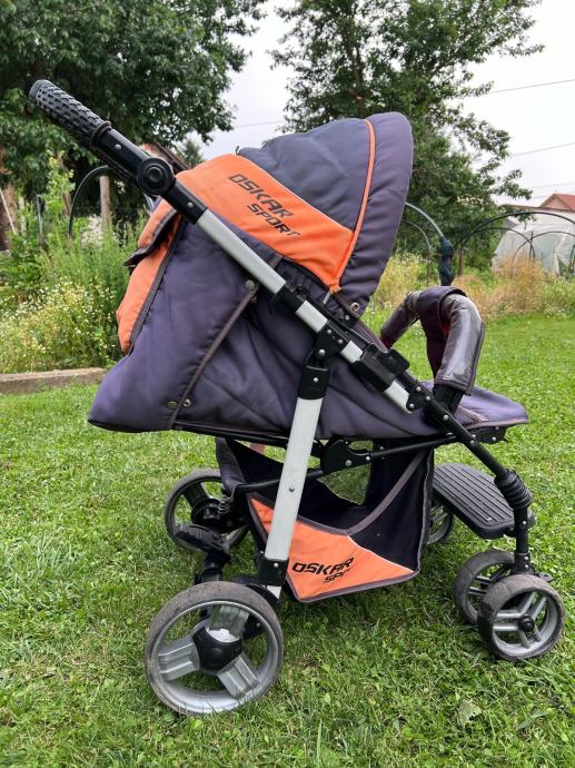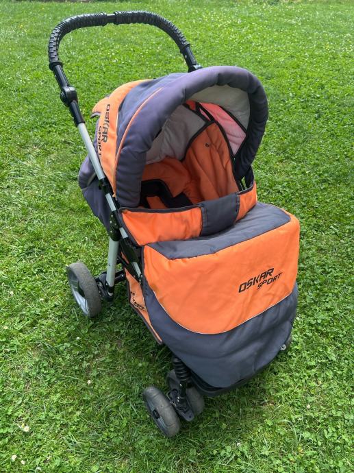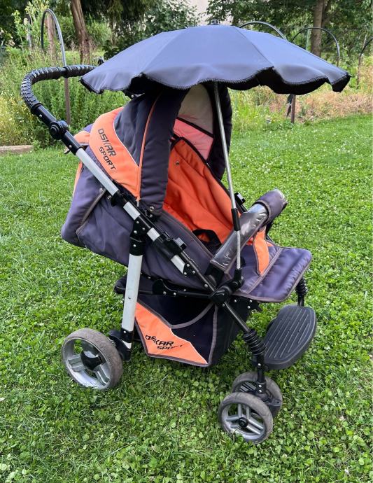 Športni voziček Adbor Oskar Sport, lepo ohranjen. Aluminijasto ogrodje, lahek, enostaven za manevriranje in zlaganje, vzmetena zadnja kolesa, vrtljiva sprednja kolesa. Varnostno zapenjanje, nastavljiv naslon in strehica. Košara in žep za odlaganje. Dežna zaščita in sončnik.