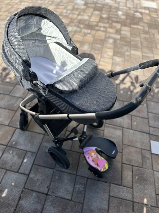 Imamo tudi rolkico za drugega otroka, ki se pripne na voziček in dežno prevleko za voziček.