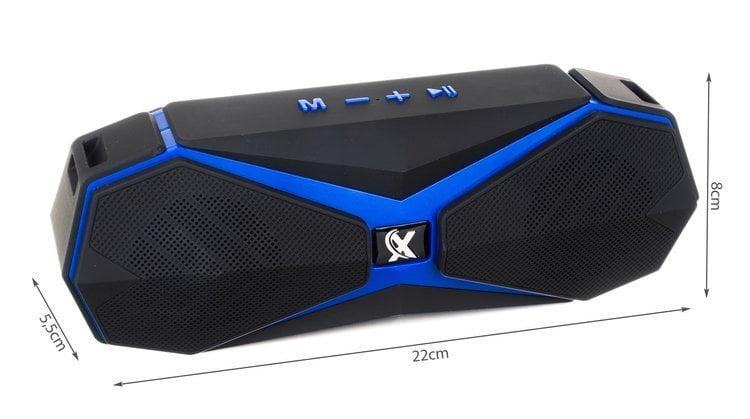 SPECIFIKACIJA – barva: črna in modra; bluetooth: da; vmesnik: USB, MicroUSB; čitalec kartic microSD / TF; format predvajanja: mp3; funkcija power bank: da; polnilni zvočnik / power bank: kabel USB / microUSB; Dolžina kabla USB – microUSB: ~ 50 cm; kapaciteta baterije: 1200mAh; frekvenčno območje: 2.40G-2.480GHZ; izhodna moč: 8W; čas predvajanja: 2-15h (odvisno od glasnosti in izbrane funkcije); bluetooth učinkovita razdalja: 10m; material: ABS plastika; mere: 5,5 / 22 / 8cm; teža: 0,463 kg; teža v paketu: 0,568 kg